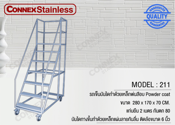 | ขนาด 280 x 170 x 70 C.M. แท่นยืน 2 เมตร กันตก 80 C.M. บันไดทางขึ้นทำด้วยเหล็กแผ่นลายกันลื่น โครงเป็นเหล็กเหลี่ยม ขนาด 32 x 32 M.M. ขนาดล้อ 6 นิ้ว (ติดเบรค 2 ล้อหน้าแบบใช้เท้าเหยียบ) มีให้เลือก 5 ขนาด