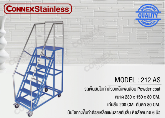 | ทำด้วยเหล็กพ่นสีและสแตนเลส โครงสร้างเป็นเหล็ก ราวจับและกันตกเป็นสแตนเลส ขนาด 280 x 150 x 80 C.M แท่นยืน 200 C.M. กันตก 80 C.M. บันไดทุกขั้น เป็นเหล็กแผ่นลาย โครงสร้างเป็นเหล็กกล่อง 32 x 32 M.M. ขนาดล้อ 6 นิ้ว มีให้เลือก 6 ขนาด