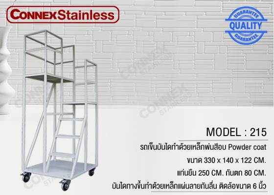 | ขนาด 330 x 140 x 122 C.M. แท่นยืน 2.50 เมตร กันตก 80 C.M. บันไดทางเดินขึ้น ทำด้วยเหล็กแผ่นลายกันลื่น โครงสร้างของเสาเป็นเหล็กเหลี่ยม ขนาด 32 x 32 M.M. พื้นด้านล่างปูด้วย เหล็กแผ่นลายเต็มพื้นด้านล่าง ขนาดล้อ 6 ล้อ ติดเบรค 2 ล้อหน้าแบบใช้เท้าเหยียบ มีให้เลือก 5 ขนาด