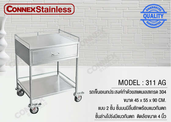| ขนาด 45 x 55 x 90 C.M. ชนิดทำด้วยสเตนเลสเกรด 304 แบบ 2 ชั้น ชั้นบนมีลิ้นชักพร้อมแนวกันตก ชั้นล่างโปร่งมีแนวกันตก ขนาดล้อ 4 นิ้ว (อิสระ 4 ล้อติดเบรค 2 ล้อ) แข็งแรง สวยงาม ทนทาน | ||||