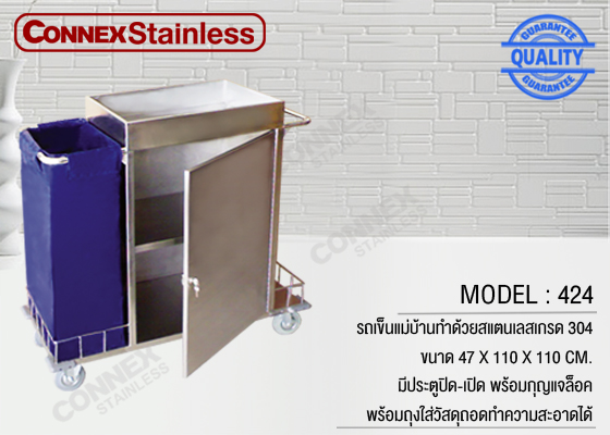 | งานโรงแรมและงานบริการห้องพัก ทำด้วยแสตนเลส เกรด 304 ขึ้นรูปสวยงามอย่างมีสัดส่วน แข็งแรง มีประตูปิด-เปิด พร้อมกุญแจล็อค ขนาด 47 X 110 X 110 ซ.ม. มีถุงสำหรับใส่ของทำด้วยผ้าใบ สามารถถอดออกทำความสะอาดได้ มี 3 ชั้น วางของได้อย่างเหมาะสม ล้อยางสีเทาอย่างดี ขนาด 5 นิ้ว ติดยางกันกระแทกทั้ง 4 มุม รับน้ำหนักได้ 300 ก.ก. | |||||