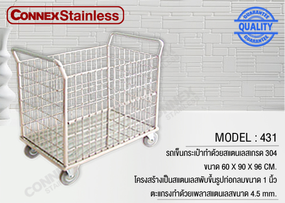 | รถเข็นแม่บ้านทำด้วยแสตนเลสเกรด 304 ขนาด 60 X 90 X 96 ซ.ม. แข็งแรง ทนทานรับงานหนัก โครงเสาทำด้วยแสตนเลสกลมขนาด 25 ม.ม. พื้นเป็นแสตนเลสด้านข้างเป็นตะแกรงทั้ง 4 ด้าน เชื่อมเสาทั้ง 4 ต้น ติดกับโครงด้านล่างทั้ง 4 มุม เพื่อเพิ่มความแข็งแรงให้กับโครงสร้าง ล้อสีเทาอย่างดีขนาด 5 นิ้ว ติดยางกันกระแทกทั้ง 4 มุม รับน้ำหนักได้ 250 ก.ก. | |||||